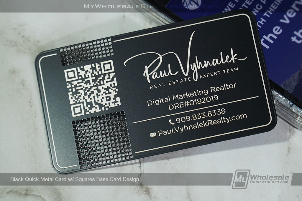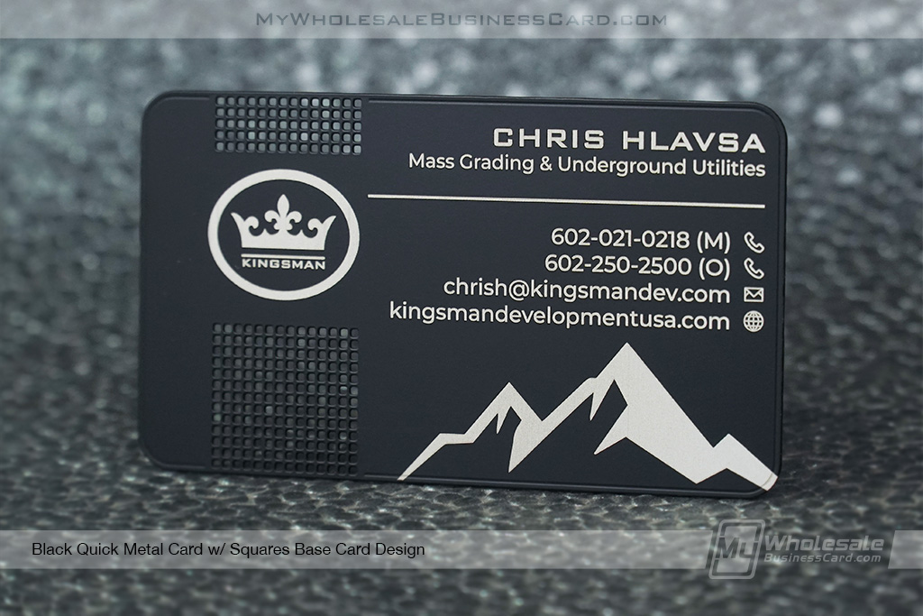 Black Quick Metal Cards - an industry first from My Metal Business Card - feature the same luxurious matte black .5mm stainless steel as our regular cards; with a few more limited customization options.